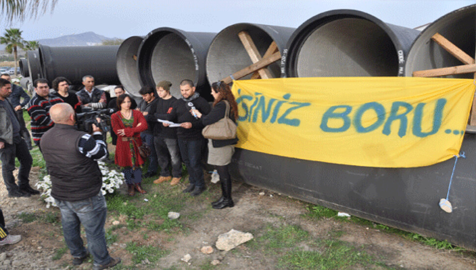 Gönyeli Çemberi'ndeki su borularının önünde gerçekleştirilen açıklamada "Asrın Projesi" olduğu iddia edilen su getirme projesinin asrın hatası olduğu vurgulandı.