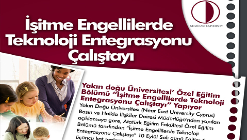 Yakın Doğu Üniversitesi Lefkoşa Kıbrıs (Near East University Nicosia Cyprus ) Basın ve Halkla İlişkiler Dairesi Müdürlüğü'nden yapılan açıklamaya göre, Atatürk Eğitim Fakültesi Özel Eğitim Bölümü tarafından "İşitme Engellilerde Teknoloji Entegrasyonu Çalıştayı" Eğitim Sarayı üçüncü kat toplantı salonunda gerçekleştirildi.