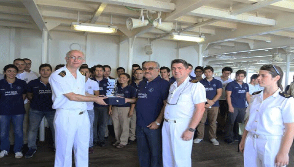 Karşılama töreninde Yrd. Doç. Dr. Ergün Demirer ile Denizcilik Fakültesi Dekan yardımcısı ve Süvari Semih Salgıncı'ya plaket takdim edildi.