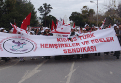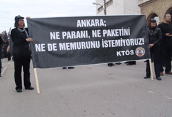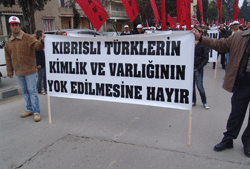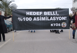 | Sendikal Platform içerisindeki tartışmaların odağındaki isim Kıbrıs Türk Öğretmenler Sendikası, bazı sendika liderlerinin "farklı pankart tepkisine" rağmen, Ankara aleyhine açtığı pankartla dikkat çekti. "Ankara ne paranı, ne paketini, ne memurunu istemiyoruz" pankartı, KTÖS üyeleri tarafından taşındı. | KTÖS'ün "Hedef belli, %100 asimilasyon" pankartı da Kıbrıslı Türklerin asimile edildiği açıklamalarına destek verici nitelikteydi. | Dün Türkiye Büyükelçiliği önünde yaptığı "şok eylemle" dikkatleri üzerine çeken Baraka Kültür Merkezi, "Ankara elini yakamızdan çek" pankartını taşıyarak, Türkiye aleyhine sloganlar attı. |