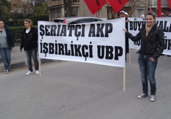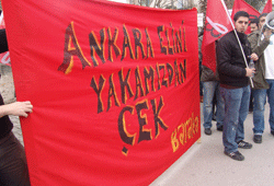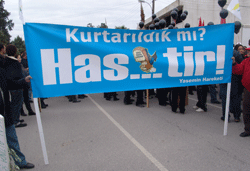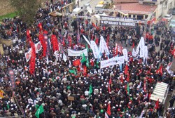 | Mitinge katılım, 2004 yılından bu yana en yüksek oranda gerçekleşti. | Mitinge katılım alana sığmadı, kalabalığın çevre yollara taştığı gözlemlendi. 30 binin üzerinde katılım olduğu iddia edildi. | Bu pankart, eylemin ilgi odaklarından birisi oldu... |