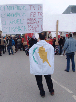 | Dünkü "şok eylemde" yer alan örgütlerden olan Yasemin Hareketi de, fotoğraftaki pankartla dikkatleri üzerine çekti. | Omuzlarına astığı "Kıbrıs Cumhuriyeti" bayrağıyla eyleme katılan vatandaş, ilginç pankartıyla da dikkat çekti. | Kaldırım üzerinde dğer kortejlerin geçişini bekleyen eylemciler, güzel görüntüler oluşturdu. |