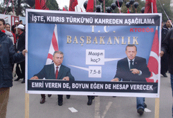 | Kıbrıs Türk Orta Eğitim Öğretmenler Sendikası'nın Erdoğan ile Küçük'ün fotoğrafıyla karikatürize edilmiş pankartının mesajı sertti: "Emri veren de, boyun eğen de hesap verecek" | Burslarının yatırılmadığı gerekçesiyle geçtiğimiz gün yaptığı eylemle gündem olan yurtdışında okuyan Kıbrıslı gençlerin örgütü Kıbrıslı Gençlik Platformu da eyleme kendi pankartı arkasında katılım sağladı. | DAÜ Bir-Sen, "Direneceğiz" pankartı ile mitingde yer aldı. |