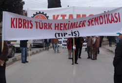 | Miting öncesinin ayrı pankart ve slogan sorunuyla ilgili en çok tartışma yaratan isimlerinden Kamu-Sen Başkanı Mehmet Özkardaş, sendikasının başında İnönü Meydanı'na doğru yürüyor. | Hemşire ve Ebeler de Toplumsal Varoluş Mitingi'ndeki yerlerini aldı. | Kıbrıs Türk Hekimler Sendikası (Tıp - İş), üyeleriyle birlikte eyleme katılım sağladı. |