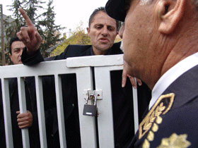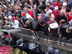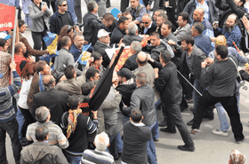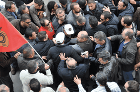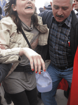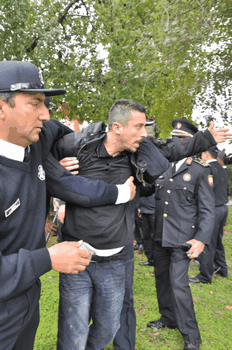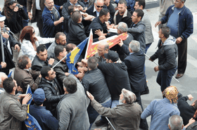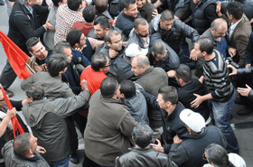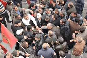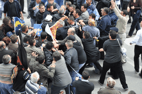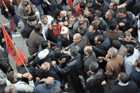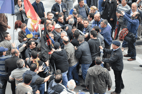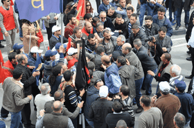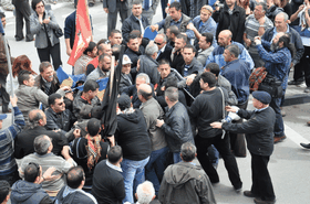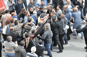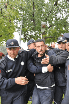 Bayrağı alan polis ile eylemciler arasında yine arbede çıktı.