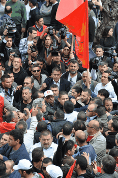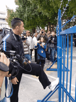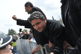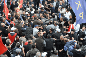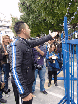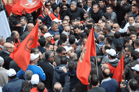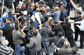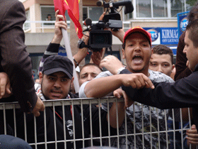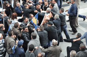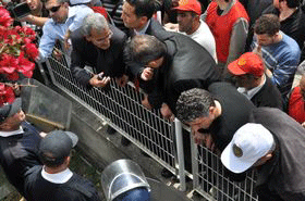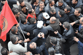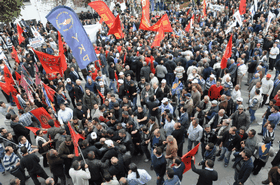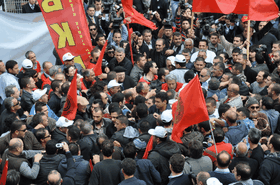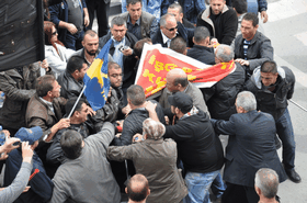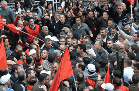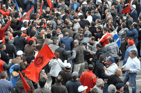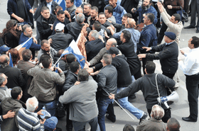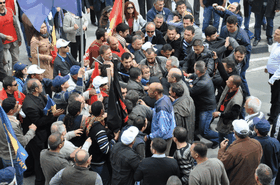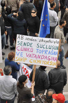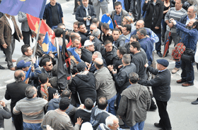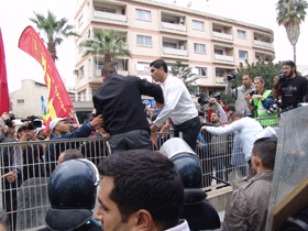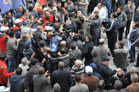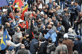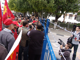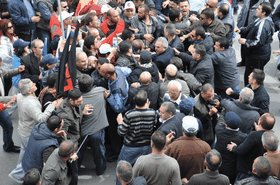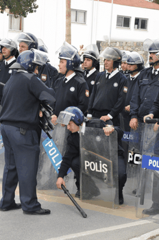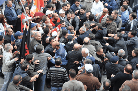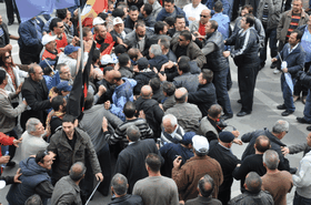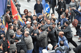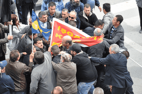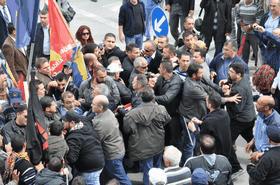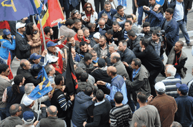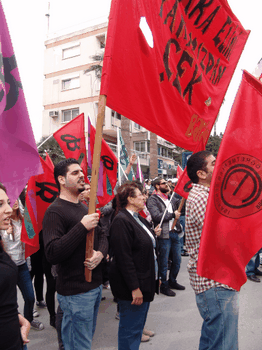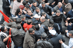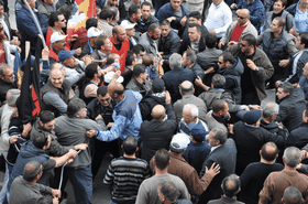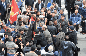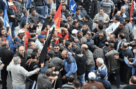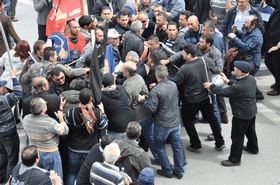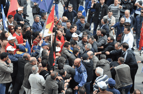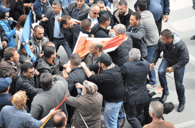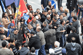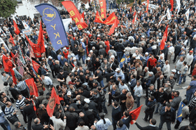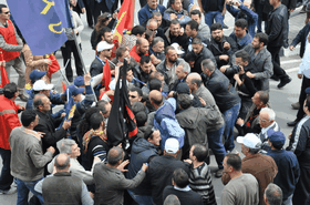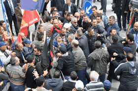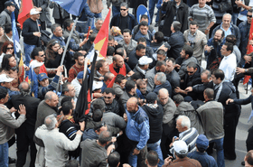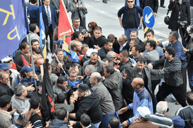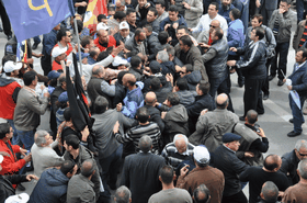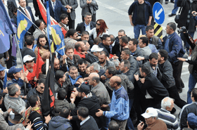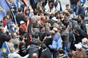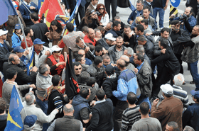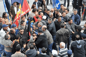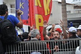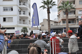 Anadolu Ajansı'nın haberine göre Sendikal Platform'un Cumhuriyet Meclisi binası yakınında düzenlediği mitingde, açılan bazı pankartlar ve Rum bayrağı dolayısıyla arbede çıktı.
