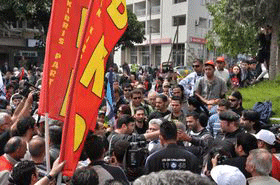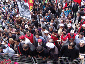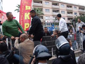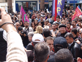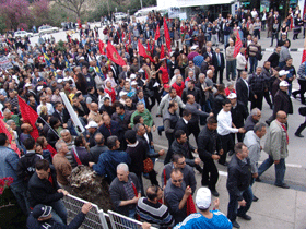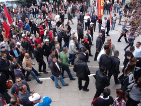 Sendikal Platform'un eylemi eski Peyak binaları önünden yürüyüşle başladı. Eylemciler, buradan sloganlar atarak Şehitler Abidesi önüne yürüdü. Burada, polisin aldığı geniş güvenlik önlemleriyle karşılaşan eylemciler, olayı protesto etti.