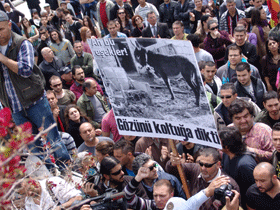 Şehitler Abidesi'nin bulunduğu meydanda toplanan kalabalık, ''Faşizme karşı omuz omuza'', ''Ankara elini yakamızdan çek'', ''Polis devleti olmayacağız'', ''Paketi getireni paket yaparız'' gibi sloganlar attı.