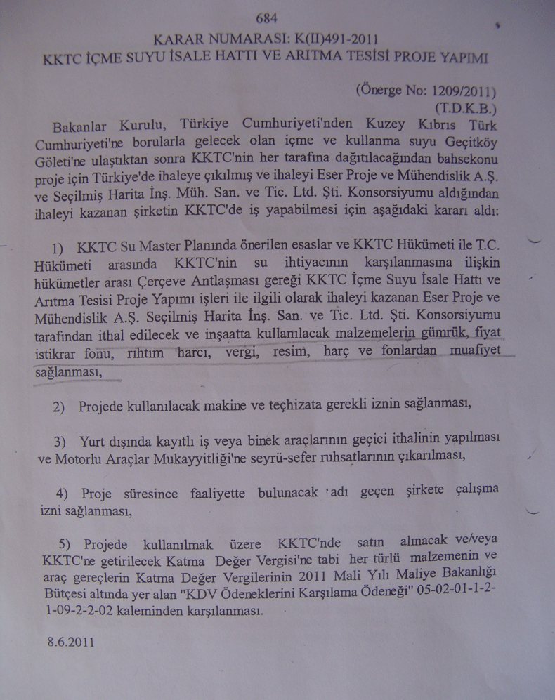 "KKTC İçme Suyu İsale Hattı ve Arıtma Tesisi Proje Yapımı" ihalesini alan Türkiyeli şirketin KKTC'de iş yapabilmesi için Bakanlar Kurulu'nun 8 Haziran 2011 tarihinde aldığı kararlarda da dikkat çeken bazı ayrıntılar bulunuyor.