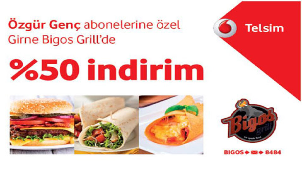 KKTC Telsim'den verilen bilgiye göre, Telsim'li olmanın avantajını her yerde yaşayan Özgür Gençliler, The Bigos Grill'den 1 ay boyunca yapacakları harcamalarda, %50 indirim fırsatından faydalanabilecek.