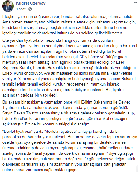 Başbakan Yardımcısı ve Dışişleri Bakanı Kudret Özersay, sosyal medya hesabından yaptığı paylaşımla "Yaşar Ersoy'un oyununa sansür" iddiaları üzerine açıklamalarda bulundu.