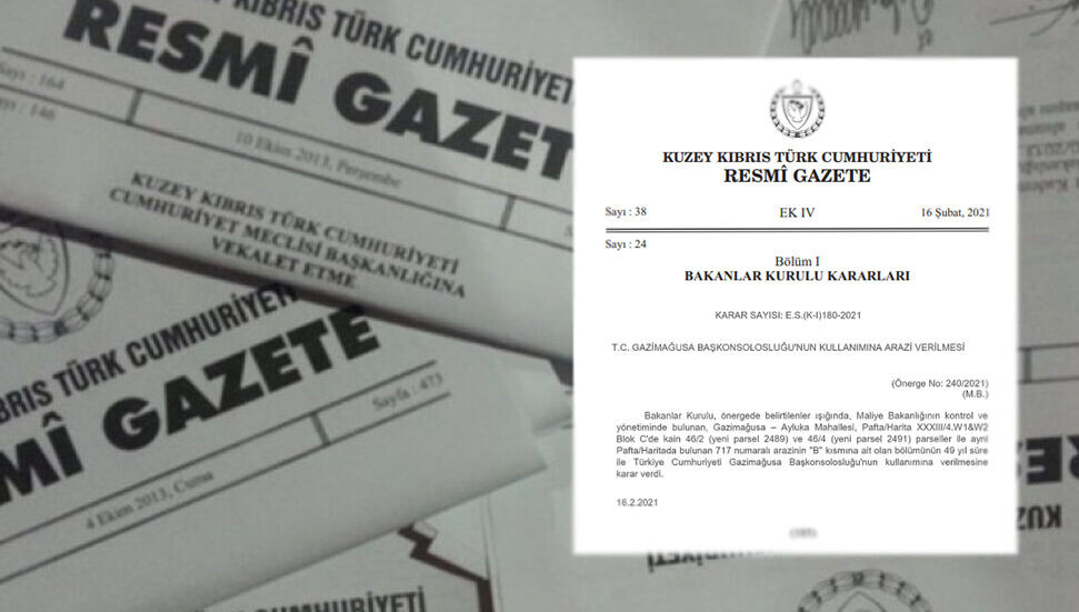 Bakanlar Kurulu, Maliye Bakanlığı'nın kontrol ve yönetiminde bulunan, Gazimağusa - Ayluka Mahallesi, Pafta/Harita XXXlll/4.W1&W2 Blok C'de kain 46/2 (yeni parsel 2489) ve 46/4 (yeni parsel 2491) parseller ile aynı Pafta/Haritada bulunan 717 numaralı arazinin "B" kısmına ait olan bölümünün 49 yıl süre ile Türkiye Cumhuriyeti Gazimağusa Başkonsolosluğu'nun kullanımına verilmesi yönünde karar aldı.