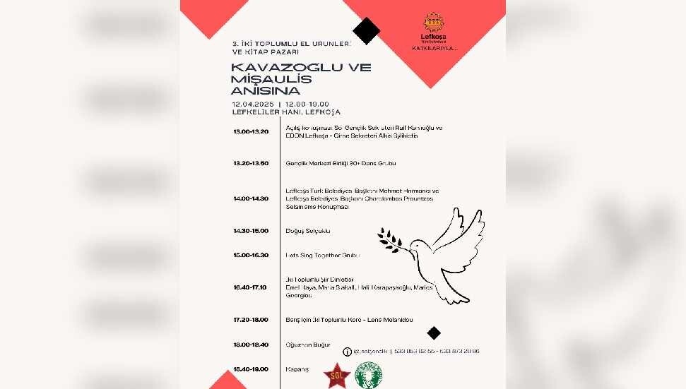 Sol Gençlik ve EDON organizatörlüğünde Kavazoğlu ve Mişaulis anısına "3. İki Toplumlu El Ürünü ve Kitap Pazarı" etkinliği cumartesi günü 12.00 ile 19.00 saatleri arasında Lefkoşa Surlariçi bölgesinde Lefkeliler Hanı Meydanı’nda düzenlenecek.