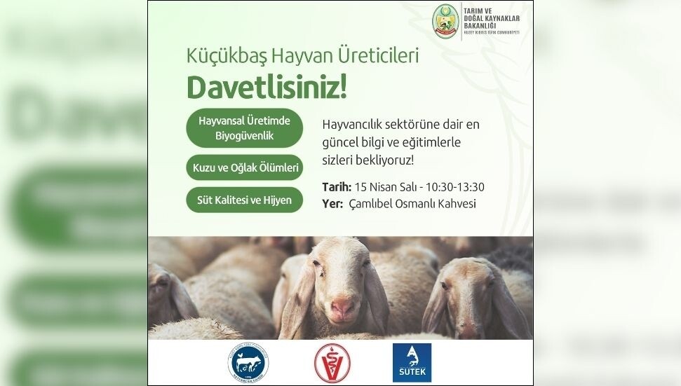Tarım ve Doğal Kaynaklar Bakanlığı, Hayvancılık Dairesi, Veteriner Dairesi ve SÜTEK iş birliğiyle, küçükbaş hayvan üreticilerine yönelik eğitim yarın Girne’deki Çamlıbel Osmanlı Kahvesi'nde düzenlenecek. Eğitimde, biyogüvenlik, kuzu ve oğlak ölümleri ile süt kalitesi ve hijyen konularında uzmanlar bilgilendirme yapacak.