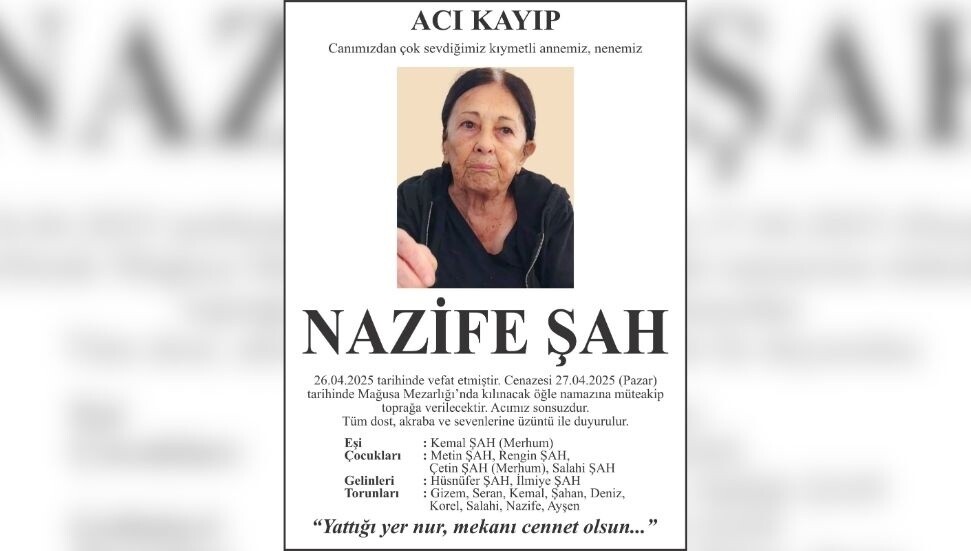 Nazife Şah hayatını kaybetti. Şah'ın cenazesi yarın öğle namazının ardından Gazimağusa Mezarlığı'na defnedilecek.