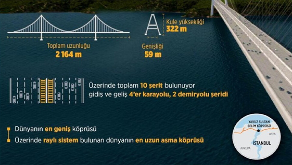 Kuzey Marmara Otoyolu Projesi kapsamında İstanbul Boğazı'na inşa edilen köprü, dünyanın en geniş köprüsü unvanını alacak. Yatırım maliyeti 3 milyar dolar olan, 148 kilometre uzunluğundaki Odayeri-Paşaköy kesimi üzerindeki köprünün, gidiş ve geliş istikametlerinde 4'er karayolu şeridi ile ortada 2 demiryolu şeridi olmak üzere toplam 10 ulaşım şeridi olacak.