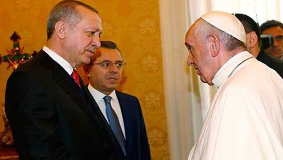 Erdoğan Vatikan'da Katoliklerin ruhani lideri Papa Franciscus ile baş başa görüştü.Papa, Apostol Sarayı'nda, konuklarını ağırladığı Kütüphane Salonu'ndaki görüşme öncesinde Cumhurbaşkanı Erdoğan'ı kapıda karşıladı.