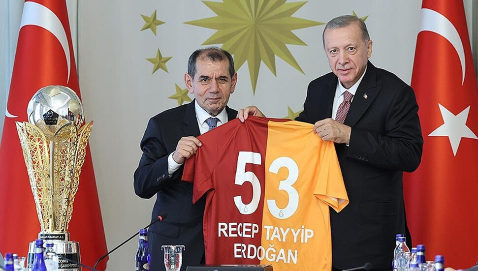 Şampiyonluk kupası ile köşke gelen Galatasaray Kulübü Başkan Dursun Özbek, Cumhurbaşkanı Erdoğan'a, üzerinde "Recep Tayyip Erdoğan" yazılı 53 numaralı Galatasaray forması hediye etti.