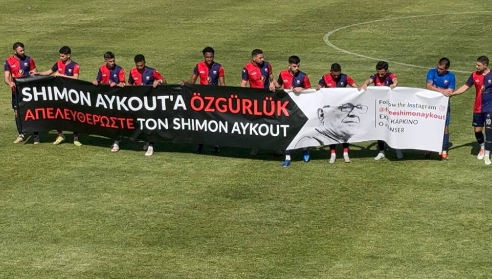Yeniboğaziçi futbol takımı, 11 aydır Güney Kıbrıs’ta tutuklu bulunan Simon Aykut’a destek için “Simon Aykut’a Özgürlük” pankartıyla sahaya çıktı; tribünler alkışlarla karşılık verdi.