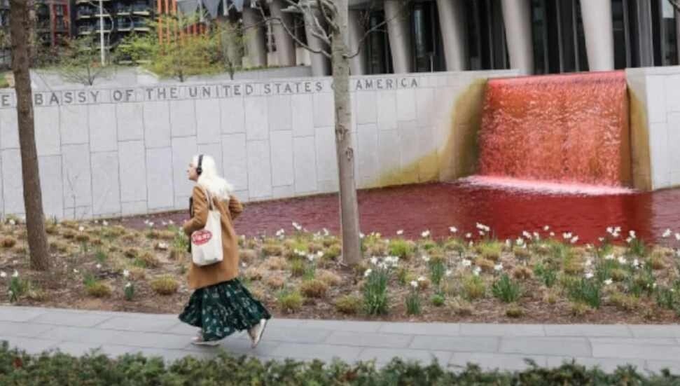 ABD'nin İsrail'e silah satışını protesto için Londra'daki büyükelçilik havuzuna kırmızı boya atıldı