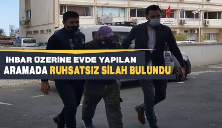 Mağusa Polis Müdürlüğü’ne bağlı Cürümleri Önleme Şubesi ekiplerinin Serkan Coşkun’un kaldığı evde yaptıkları aramada elbise dolabı içerisinde gizlenmiş vaziyette 1 adet 9 mm çapında tabanca tespit edildi.