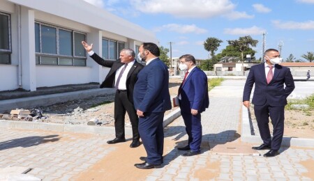 İskele Belediyesi Başkanı Hasan Sadıkoğlu, Milli Eğitim ve Kültür Bakanı Olgun Amcaoğlu ile birlikte yapımı devam eden İskele Türk Maarif Koleji binasının inşaatında incelemelerde bulundu.