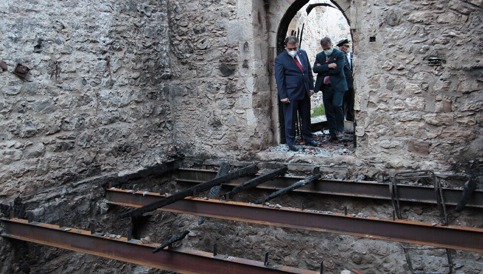 Başbakan Ersan Saner ile Başbakan Yardımcısı Ekonomi ve Enerji Bakanı Erhan Arıklı, dün yıldırım düşmesi sonucu çıkan yangında zarar gören St. Hilarion Kalesi’nde incelemelerde bulundu.
