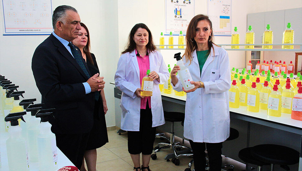 Milli Eğitim ve Kültür Bakanı Nazım Çavuşoğlu bugün Namık Kemal Lisesi’ni ziyaret ederek, öğretmenler tarafından üretilen kolonya ve dezenfektanları inceledi.