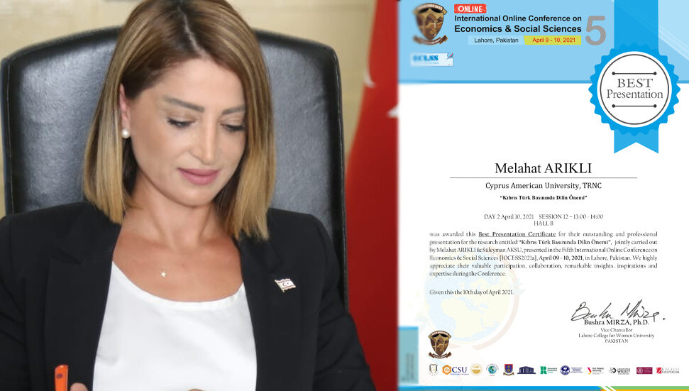 Kıbrıs Amerikan Üniversitesi (KAÜ) Akademisyeni Doç. Dr. Melahat Arıklı, Pakistan’ın Lahore kentinde bu yıl 5’incisi gerçekleşen “Uluslararası Ekonomi ve Sosyal Bilimler Online Konferansı”nda, “En İyi Bildiri” ödülüne layık görüldü.