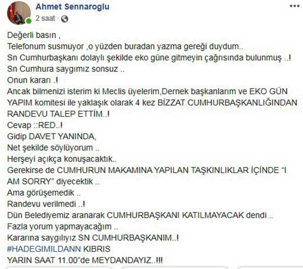 Büyükkonuk Belediye Başkanı Ahmet Sennaroğlu Cumhurbaşkanı Mustafa Akıncı'nın Büyükkonuk Belediyesi Eko Gün etkinliği ile ilgili paylaşımı üzerine sosyal medya hesabından açıklama yaptı.