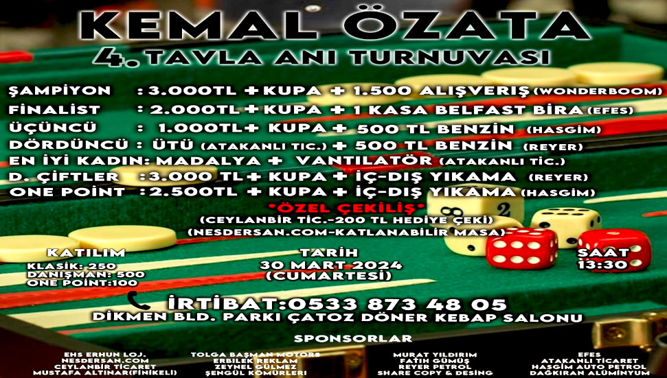 Kemal Özata'nın anısını yaşatmak amacıyla düzenlenen tavla turnuvasının dördüncüsü 30 Mart Cumartesi günü Dikmen Çatoz Büfe’de gerçekleşecek.