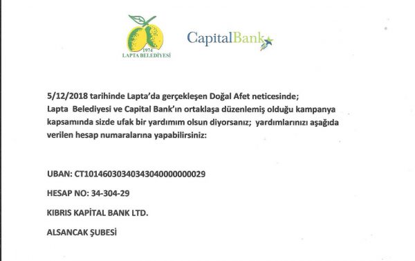 Lapta Belediyesi ve Capital Bank'ın ortaklaşa başlatmış olduğu kampanyaya duyarlı vatandaşların destek olması bekleniyor.