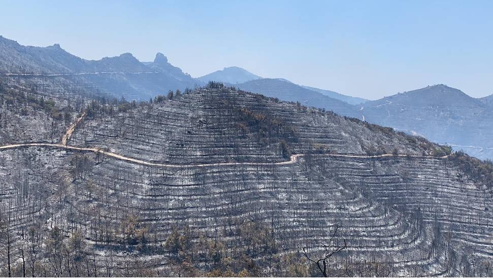 Mersinlik köyünden dağlık alana çıkan asfalt yol kenarındaki ağaçların, olası yangın riskine karşı ekipler tarafından budanıyor. Sivil savunma, itfaiye ekipleri, askeri personeller ve halktan vatandaşlar yangına müdahale etmek için çalışmalarını sürdürüyor.