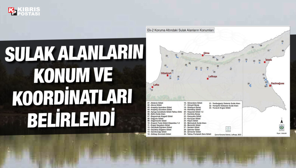 “1.Akdeniz Göleti-Girne, 2. Akova Göleti -Gazimağusa , 3-Arapköy Ayandere Göleti- Girne, 4- Arapköy Uzundere Göleti-Girne, 5. Ayluga Çanakkale Göleti, Tatlısu Gölü- Gazimağusa, 6. Bafra Sulak Alanı- İskele, 7. Beşparmak Alagadi Göleti- Girne, 8. Dağyolu Göleti –Girne, 9. Değirmenlik Göleti- Lefkoşa, 10. Engomi Tuzla Göleti, Glapsides 1 ve Glapsides 2- Gazimağusa, 11. Ergazi Sayadere Göleti-İskele, 12. Geçitkale Eğridere Göleti-Gazimağusa, 13. Geçitköy Dağdere Göleti- Girne, 14. Gemikonağı Göleti- Güzelyurt-Lefke, 15. Gölbaşı Sınırüstü Göleti-Gazimağusa, 16. Gönendere Göleti-Gazimağusa, 17. Gönyeli Barajı- Lefkoşa, 18. Güzelyurt Barajı-Güzelyurt, 19. Hamitköy Göleti-Lefkoşa, 20. Haspolat Göleti 1 ve 2 Lefkoşa, 21. Kanlıköy Barajı- Lefkoşa, 22. Karşıyaka Göleti-Girne, 23. Koruçam Göleti-Girne, 24. Köprü Göleti-Gazimağusa, 25. Mehmetçik Sulak Alanı-İskele, 26. Mersinlik Göleti-İskele, 27. Serdarlı Göleti- Gazimağusa, 28. Şahinler Göleti- Güzelyurt, 29. Şirinevler Göleti-Girne, 30. Tatlısu Portakkallı Dere Göleti-Gazimağusa, 31. Yeniboğaziçi Salamis Sulak Alanı-Gazimağusa, 32. Yenişehir Gülseren Sulak Alanı- Gazimağusa, 33. Yuvacık Ovgos Göleti- Güzelyurt.”