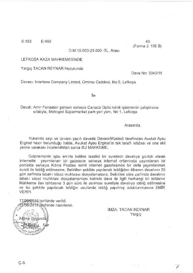 Lefkoşa Kaza Mahkemesi - Celpname - Dava No: 3343/2015 – 10 Nisan 2015