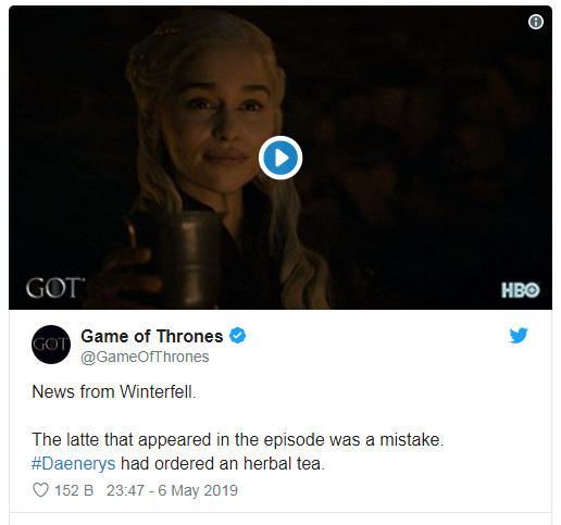 Game of Thrones'un 8. sezon 4. bölümündeki bir sahnede Daenerys'in önünde bir Starbucks kahve bardağının unutulmuş olması dizinin hayranlarının gözünden kaçmamıştı.
