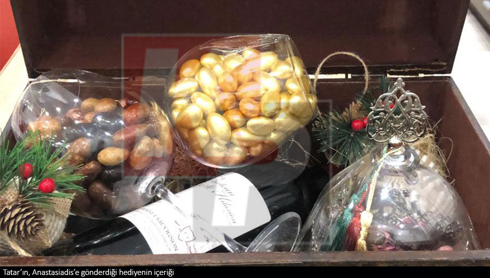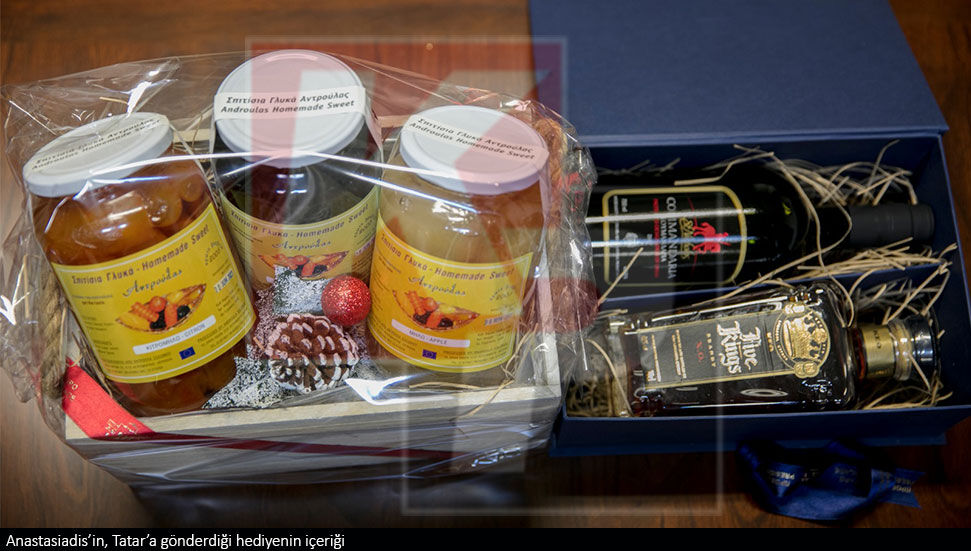 Rum lider Anastasiadis’in gönderdiği pakette ise yerel macun çeşitleri, ‘brandy’ ve ‘Gumandaria’ şarabı yer aldı.