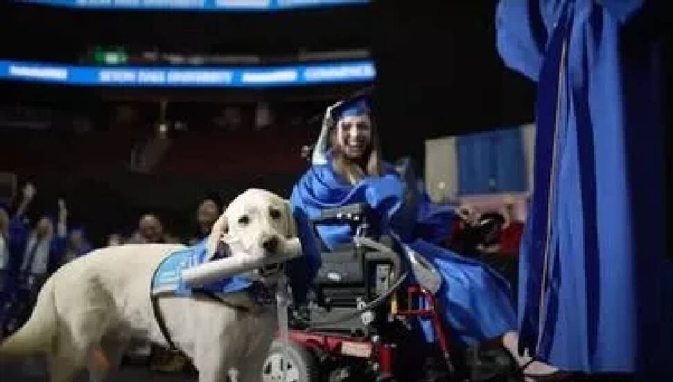 Köpeğin, sahibiyle birlikte diplomasını aldığı anların görüntüleri sosyal medyada kısa sürede viral oldu.
