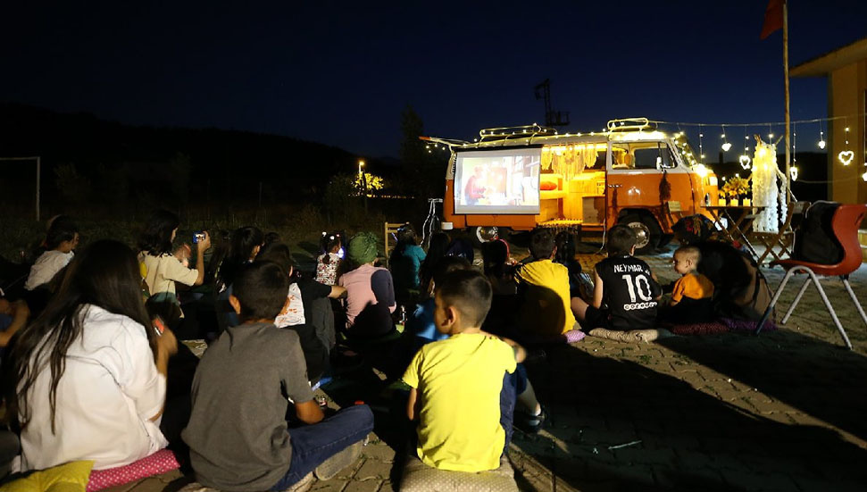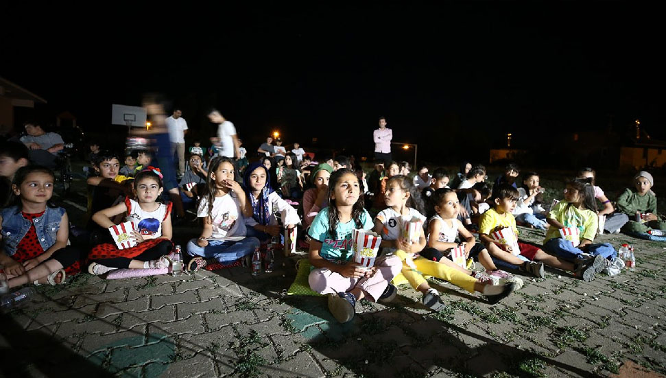 Çocuklar yıldızların altında, ikram edilen patlamış mısır ve gazoz eşliğinde film izleyerek, mutlu anlar yaşadı.