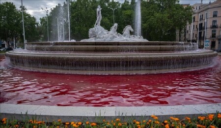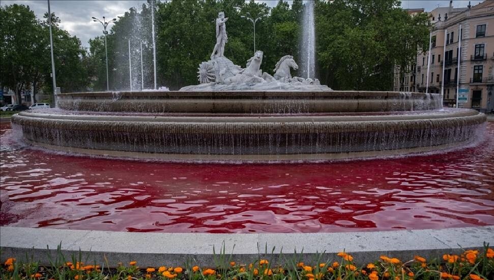 İsrail'e silah satışını protesto amacıyla Madrid'deki Neptün Çeşmesi'ne kırmızı boya atıldı