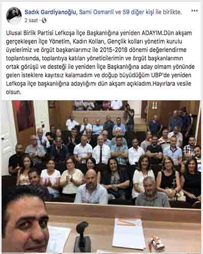Ulusal Birlik Partisi Lefkoşa İlçe Başkanlığına yeniden ADAYIM.Dün akşam gerçekleşen İlçe Yönetim, Kadın Kolları, Gençlik kolları yönetim kurulu üyelerimiz ve örgüt başkanlarımız ile 2015-2018 dönemi değerlendirme toplantısında, toplantıya katılan yöneticilerimin ve örgüt başkanlarımın ortak görüşü ve desteği ile yeniden İlçe Başkanlığına aday olmam yönünde gelen isteklere kayıtsız kalamadım ve doğup büyüdüğüm UBP'de yeniden Lefkoşa ilçe başkanlığına adaylığımı dün akşam açıkladım.Hayırlara vesile olsun.
