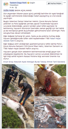 Taşkent Doğa Parkı facebook hesabından yapılan paylaşımda, eşeğin vurularak öldürüldüğü belirtiliyor..