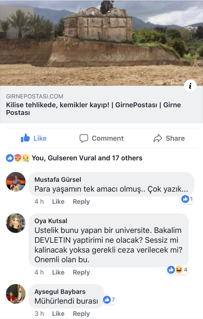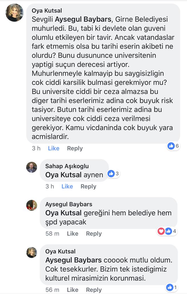 Girne'nin sevilen isimlerinden öğretmen Oya Kutsal da aynı paylaşım altına "Sevgili Aysegul Baybars, Girne Belediyesi muhurledi. Bu, tabi ki devlete olan guveni olumlu etkileyen bir tavir. Ancak vatandaslar fark etmemis olsa bu tarihi eserin akibeti ne olurdu? Bunu dusununce universitenin yaptigi suçun derecesi artiyor. Muhurlenmeyle kalmayip bu saygisizligin cok ciddi karsilik bulmasi gerekmiyor mu? Bu universite ciddi bir ceza almazsa bu diger tarihi eserlerimiz adina cok buyuk risk tasiyor. Butun tarihi eserlerimiz adina bu universiteye cok ciddi ceza verilmesi gerekiyor. Kamu vicdaninda cok buyuk yara acmislardir" paylaşımı yaptı.