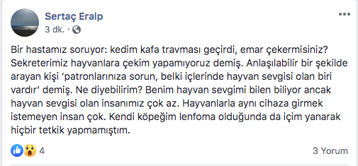 Sertaç Eralp, "Bir hastamız soruyor: kedim kafa travması geçirdi, emar çekermisiniz? Sekreterimiz hayvanlara çekim yapamıyoruz demiş. Anlaşılabilir bir şekilde arayan kişi 'patronlarınıza sorun, belki içlerinde hayvan sevgisi olan biri vardır' demiş. Ne diyebilirim? Benim hayvan sevgimi bilen biliyor ancak hayvan sevgisi olan insanımız çok az. Hayvanlarla aynı cihaza girmek istemeyen insan çok. Kendi köpeğim lenfoma olduğunda da içim yanarak hiçbir tetkik yapmamıştım" diye yazdı...