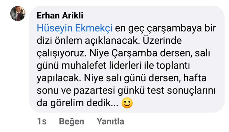 Arıklı, “En geç çarşambaya bir dizi önlem açıklanacak. Üzerinde çalışıyoruz. Niye Çarşamba dersen, salı günü muhalefet liderleri ile toplantı yapılacak. Niye salı günü dersen, hafta sonu ve pazartesi günkü test sonuçlarını da görelim dedik...” ifadelerini kullandı.