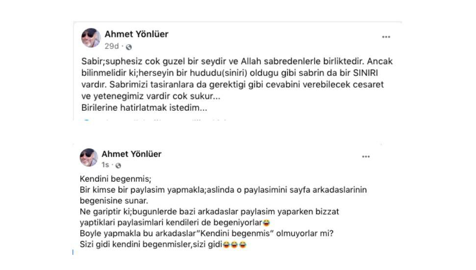 Yönlüer, kendini beğenmişlik üzerine manidar bir yorum paylaşırken, hemen ardından da “Sabrın da bir sınırı vardır. Sabrımızı taşıranlara da gerektiği gibi cevabını verebilecek cesaret ve yeteneğimiz vardır çok şükür... Birilerine hatırlatmak istedim...” diye ekledi.