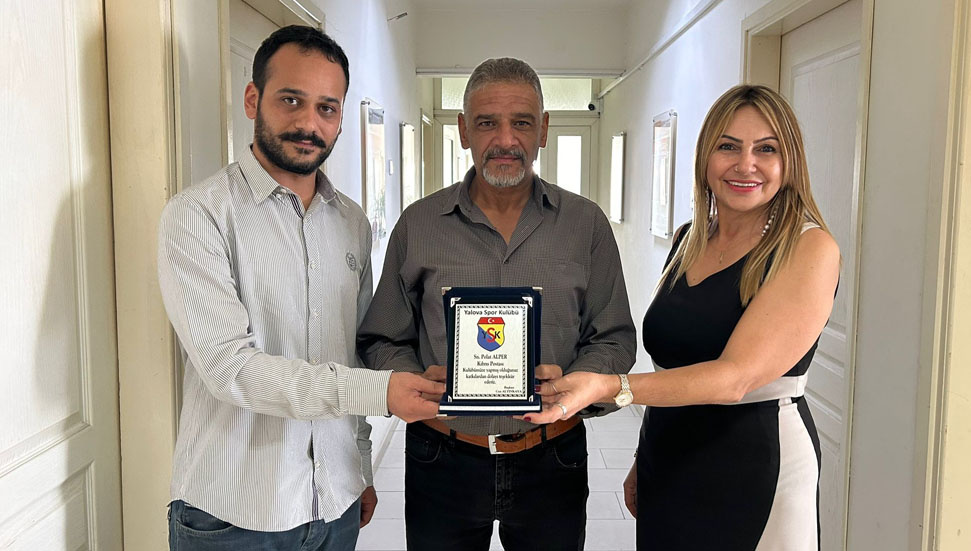 Yalova Spor Kulübü, katkılarından dolayı Kıbrıs Postası Yönetim Kurulu Başkanı Polat Alper’e teşekkür etmek adına gazetemize plaket takdim etti.