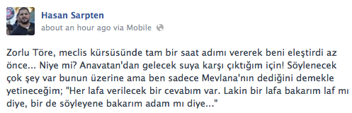 Zorlu Töre, meclis kürsüsünde tam bir saat adımı vererek beni eleştirdi az önce... Niye mi? Anavatan'dan gelecek suya karşı çıktığım için! Söylenecek çok şey var bunun üzerine ama ben sadece Mevlana'nın dediğini demekle yetineceğim; "Her lafa verilecek bir cevabım var. Lakin bir lafa bakarım laf mı diye, bir de söyleyene bakarım adam mı diye..."