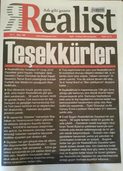 İşadamı Temel Bulut ve Harun Denizkan ortaklığıyla 27 Ocak tarihinde yayın hayatına başlayan REALİST - KULİS Gazetesi bugün "Teşekkürler" manşeti ile yayın hayatına son verdi.