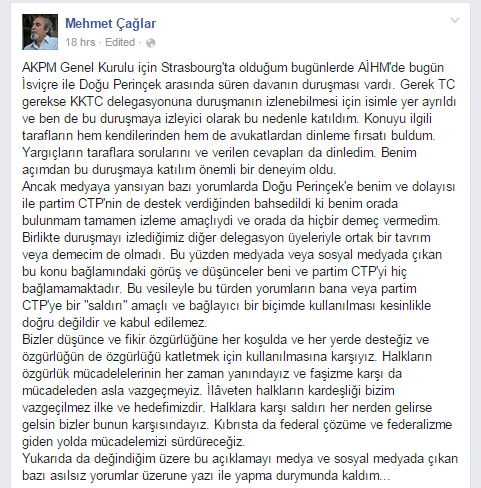 "AKPM Genel Kurulu için Strasbourg'ta olduğum bugünlerde AİHM'de bugün İsviçre ile Doğu Perinçek arasında süren davanın duruşması vardı. Gerek TC gerekse KKTC delegasyonuna duruşmanın izlenebilmesi için isimle yer ayrıldı ve ben de bu duruşmaya izleyici olarak bu nedenle katıldım. Konuyu ilgili tarafların hem kendilerinden hem de avukatlardan dinleme fırsatı buldum. Yargıçların taraflara sorularını ve verilen cevapları da dinledim. Benim açımdan bu duruşmaya katılım önemli bir deneyim oldu.